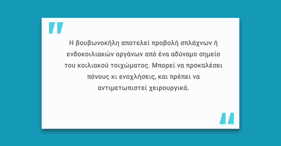 Η βουβωνοκήλη αποτελεί προβολή σπλάχνων ή ενδοκοιλιακών οργάνων από ένα αδύναμο σημείο του κοιλιακού τοιχώματος. Μπορεί να προκαλέσει πόνους κι ενοχλήσεις, και πρέπει να αντιμετωπιστεί χειρουργικά.
